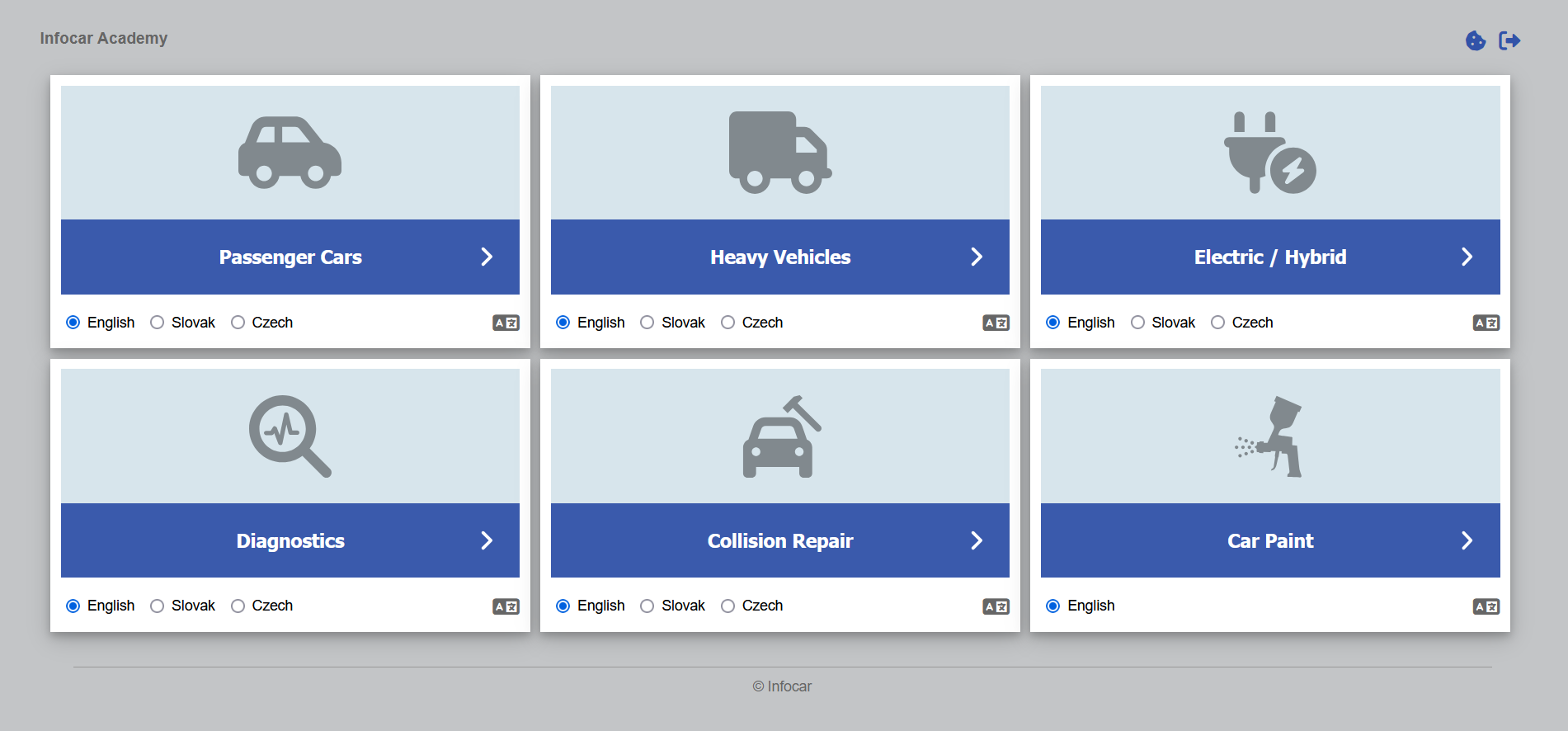 Elearnigová učebnica Infocar Academy je komplexnou učebnou pomôckou autoopravárenské či dopravné profesie. Nájdete v nej komplexné učebné podklady vysvetlené jednoduchou grafickou formou. Je zameraná predovšetkým vo vzdelávanie v odboroch automechanik, autoelektrikár, autokarosár, autolakovník a autotronik. Tiež je používaná pri výučbe odborov ako je automobilová diagnostika a servis, dopravné prostriedky, alebo prevádzka a ekonomika dopravy.